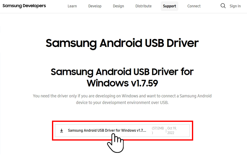 - Open your web browser and navigate to the Samsung developer website here https://developer.samsung.com/android-usb-driver.